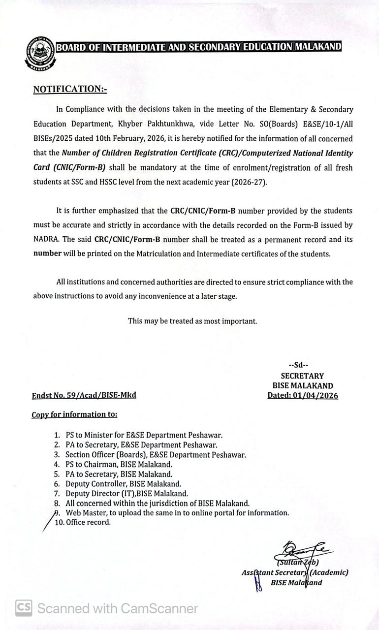 Mandatory CNIC/Form-B for Fresh Enrolment (SSC & HSSC) – Academic Year 2026-27 Onward