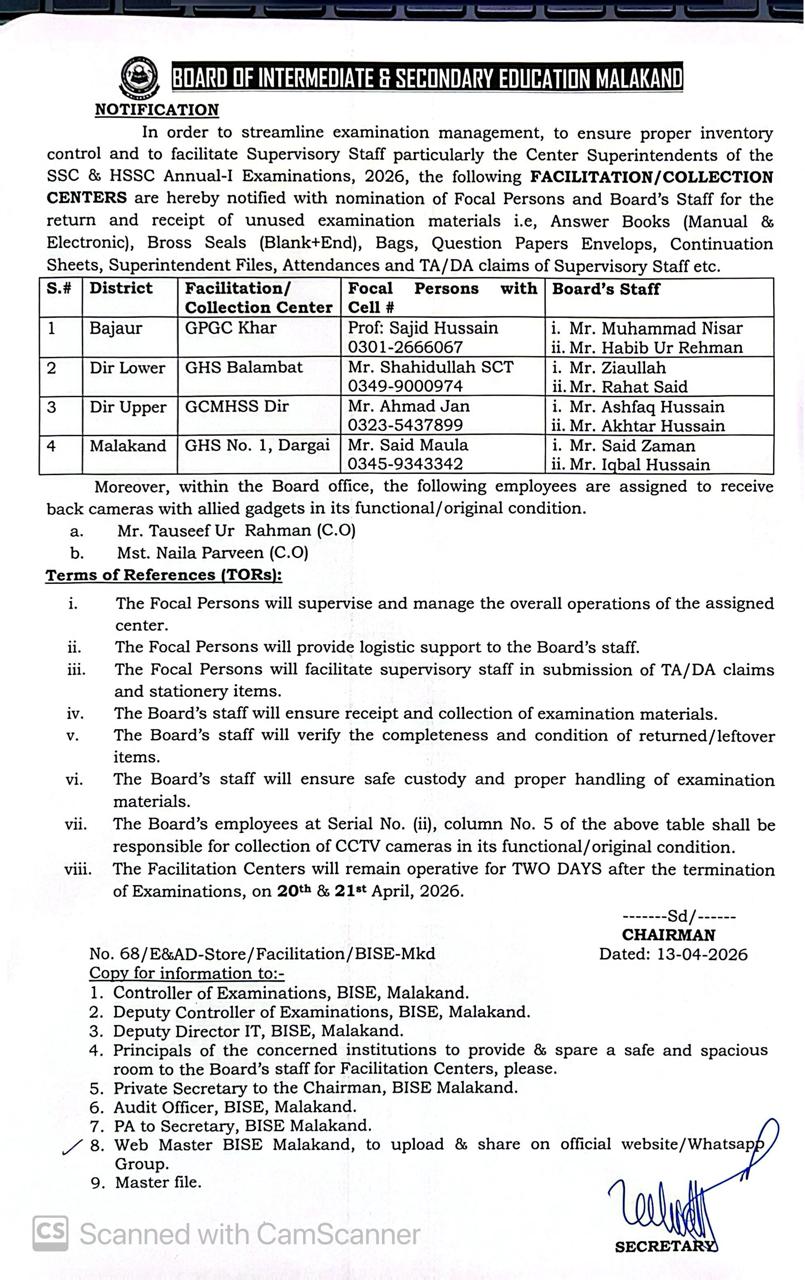 Facilitation/Collection Center Estiblishment for SSC & HSSC Annual-I 2026