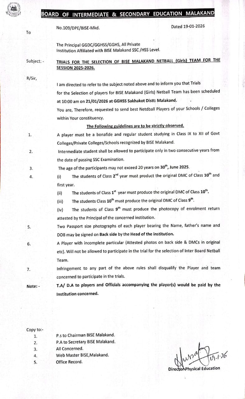 TRIALS FOR NETBALL(GIRLs) TEAM: BISE MALAKAND, FOR SESSION 2025-2026
