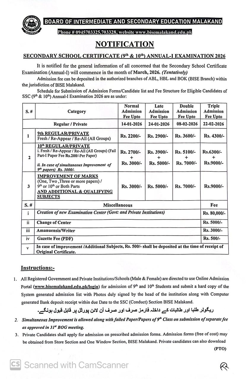 Notification: Matric (SSC) (9th & 10th) Annual-I Examination 2026 Admissions Dates and Fee