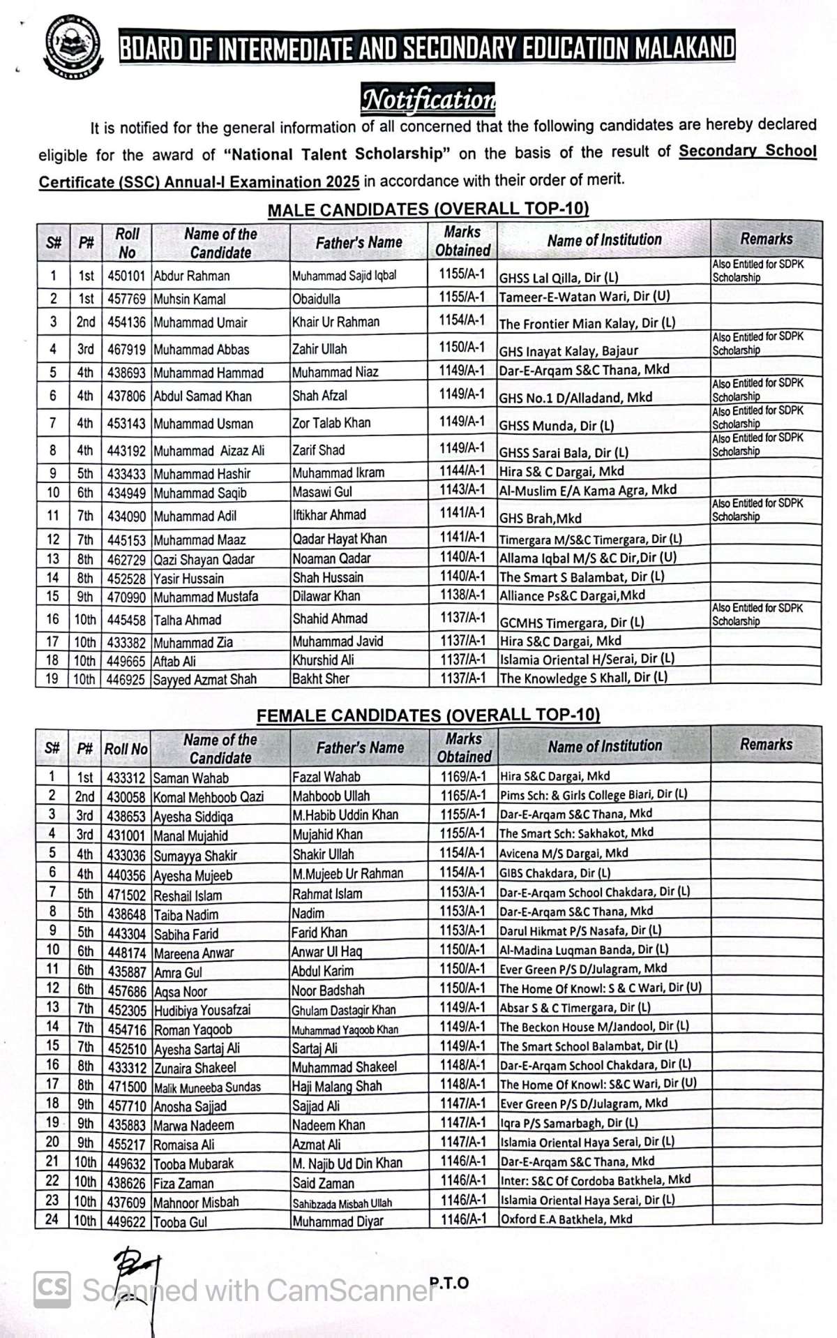 میٹرک (ایس ایس سی) سالانہ اول 2025 کے لیے نیشنل ٹیلنٹ اسکالرشپ کے امیدواروں کی فہرست جاری ہوگئی۔